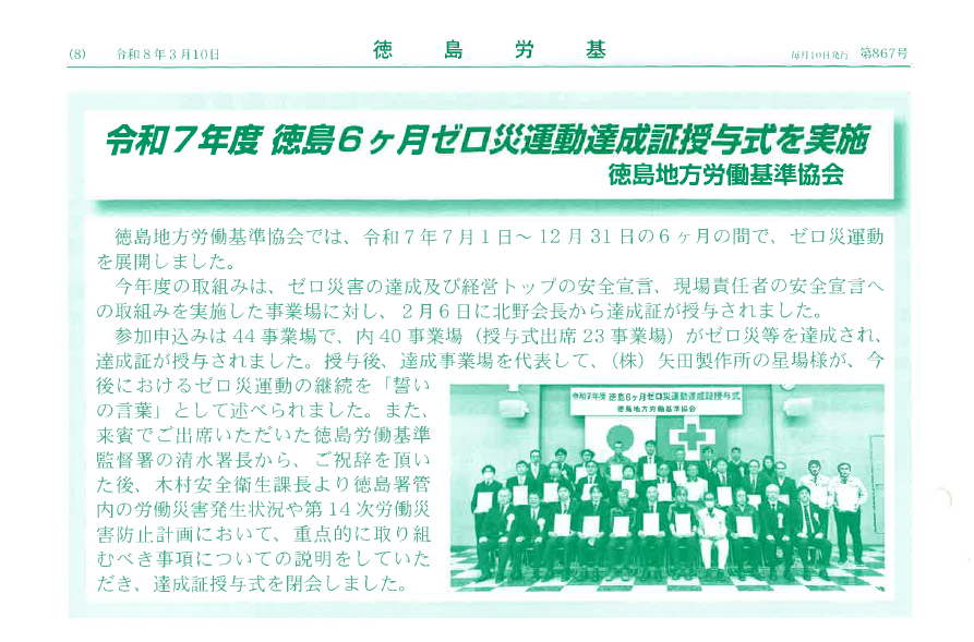 暖かくなってきたと思ったら、また寒くなってきたり・・・花粉が沢山飛び出したりと体調管理が大変な時期です・・・。 さて、徳島労基の3月号の「令和7年度徳島6ヶ月ゼロ災運動達成証授与式を実施」に社長が掲載されました。 …