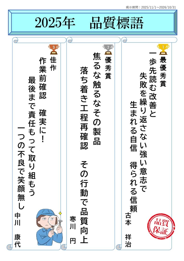 2025年の品質月間のテーマは「今こそみんなで考えよう!これからの品質の力」です。このテーマは、品質管理の重要性を再認識し、今後の製品向上に向けた取り組みを促進することを目的としています。